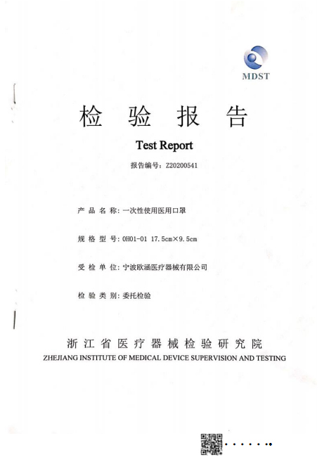 OH01-01(绑带式) 一次性使用医用口罩检测报告
