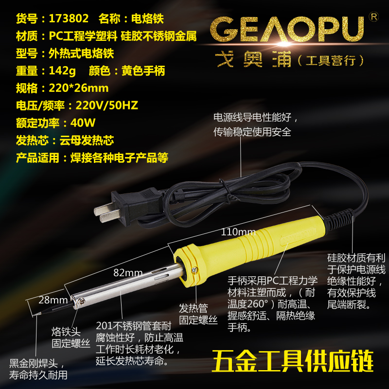 本网页所展示的有关【外热式电烙铁】的信息/图片/参数等由的会员【宁波市戈奥浦工具有限公司】提供,由会员【宁波市戈奥浦工具有限公司】自行对信息/图片/参数等的真实性、准确性和合法性负责, 本平台(本网站)仅提供展示服务,请谨慎交易,因交易而产生的法律关系及法律纠纷由您自行协商解决,本平台(本网站)对此不承担任何责任。