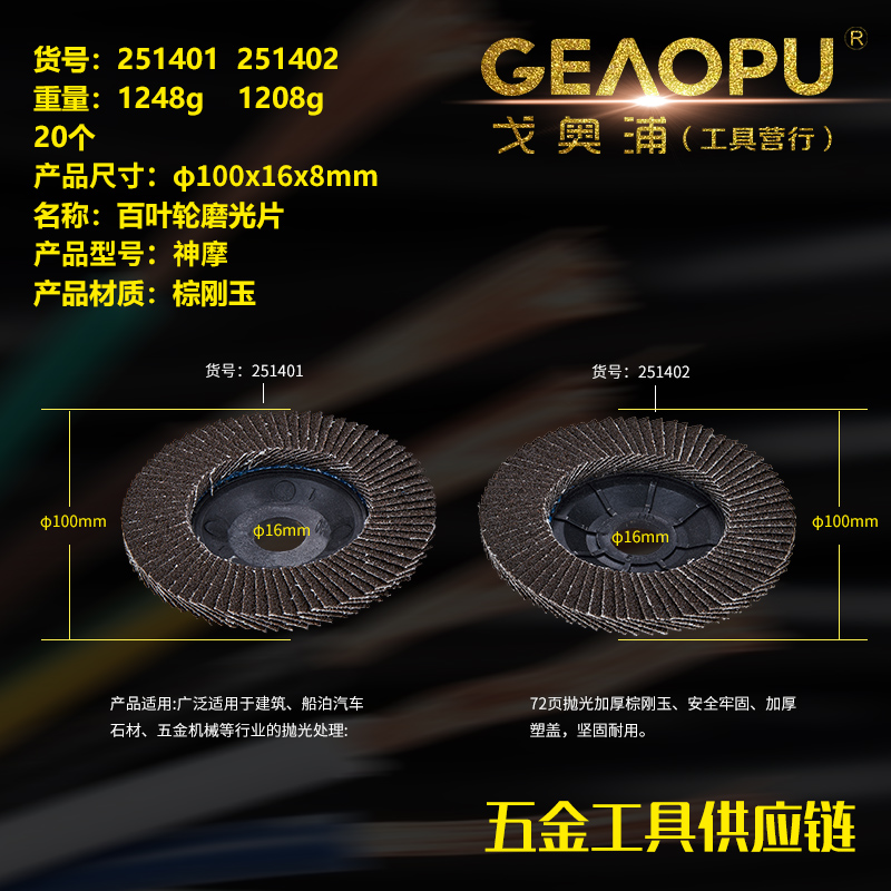 本网页所展示的有关【百叶轮磨光片】的信息/图片/参数等由的会员【宁波市戈奥浦工具有限公司】提供,由会员【宁波市戈奥浦工具有限公司】自行对信息/图片/参数等的真实性、准确性和合法性负责, 本平台(本网站)仅提供展示服务,请谨慎交易,因交易而产生的法律关系及法律纠纷由您自行协商解决,本平台(本网站)对此不承担任何责任。