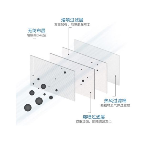 产品由口罩体、鼻夹和口罩带组成,其中口罩体由无纺布层、双重熔喷过滤层、热风过滤棉组成。