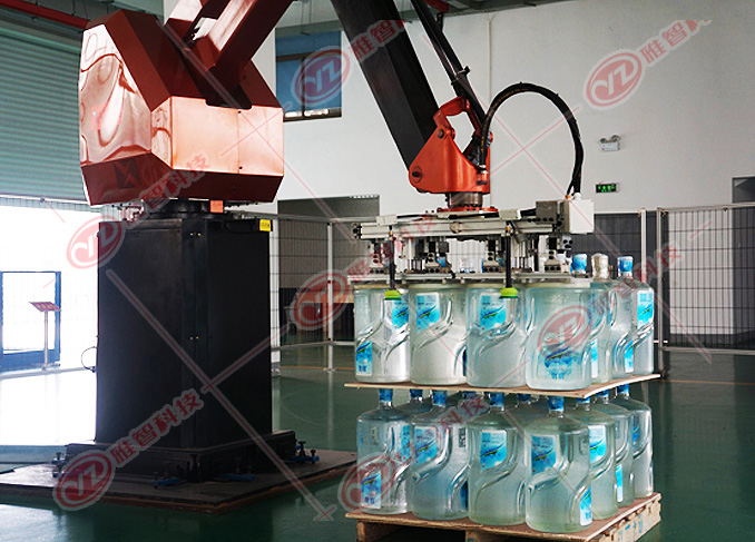 智能桶码垛系统是将装入桶等的物料或者是经过包装和未经包装的规则物品,按一定排列码放在托盘(木质)上,进行自动堆码,可堆码多层,然后推出,便于继续进行下一步包装或者叉车运至仓库储存。码垛机实现智能化操作管理,可大大地减少劳动人员和降低劳动强度。全自动包装码垛设备广泛用于石化、食品、医药、饲料、粮食、有色矿物和建材等行业中的粉状、粒状物料、规则有一定体积物品的自动包装和自动码垛。