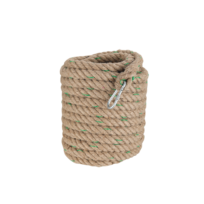 材质:采用优质黄麻丝,破断拉力≥8000N,麻绳直径30mm,长度25m,重量:7.6kg,内含3mm软性浸塑钢丝,绳端附带锁扣式防脱挂钩。